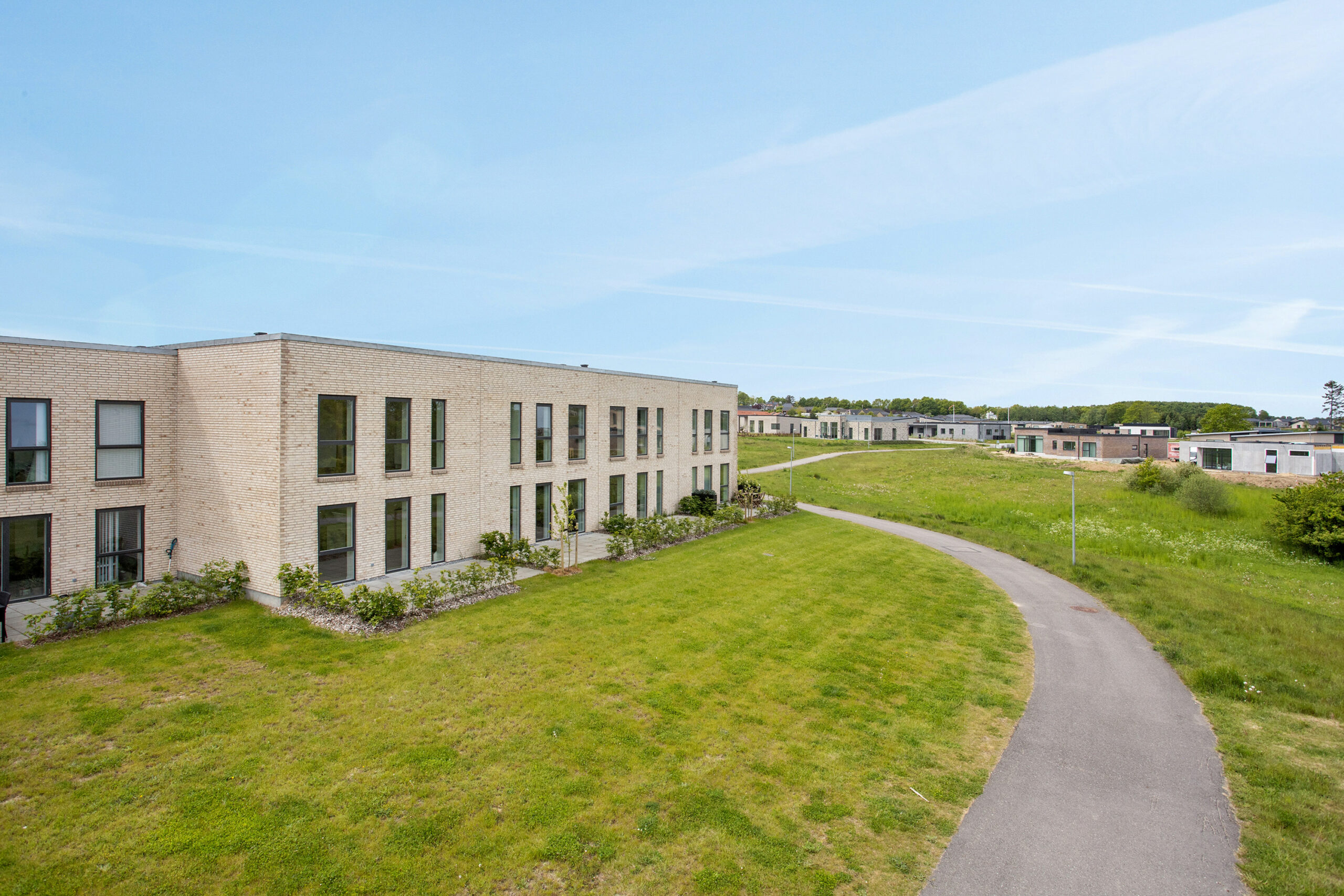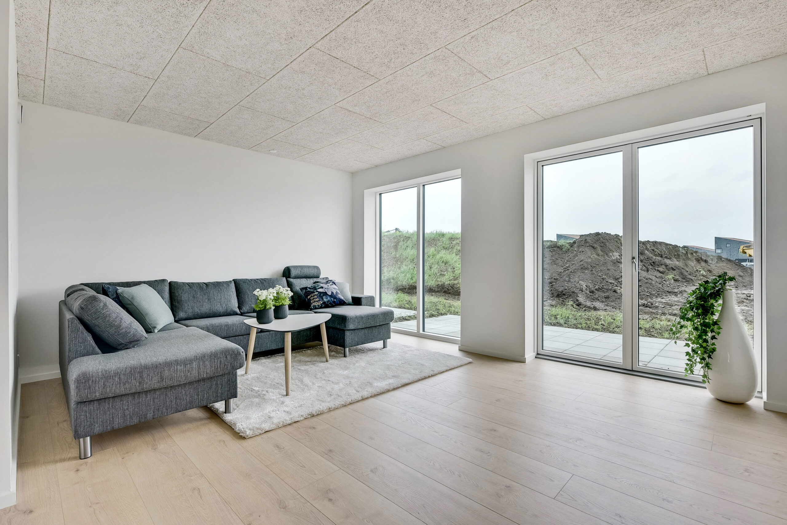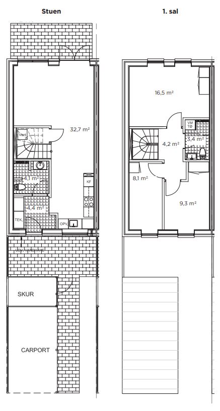 På 1. salens badeværelse er der gulvvarme. Ventilationsanlæg sikrer et godt indeklima. Mindre depotrum under trappen til 1. sal. Til hvert hus er der en god carport med sensorstyrede spots i loftet. Desuden eget skur til praktisk opbevaring af fx cykler. Foran huset er der mulighed for at indrette en hyggelig gårdhave. Udvendigt er der ved indgangsdøren desuden vandhane og ekstra strømstik. Private terrasser på husets haveside er adskilt af hække. I hele området bliver der grøn Sedumbeplantning på tagene, som er både smuk og praktisk. De kønne stenurter kan optage op til 50 % af al regnvand, hvilket aflaster øvrig regnvandsafledning.