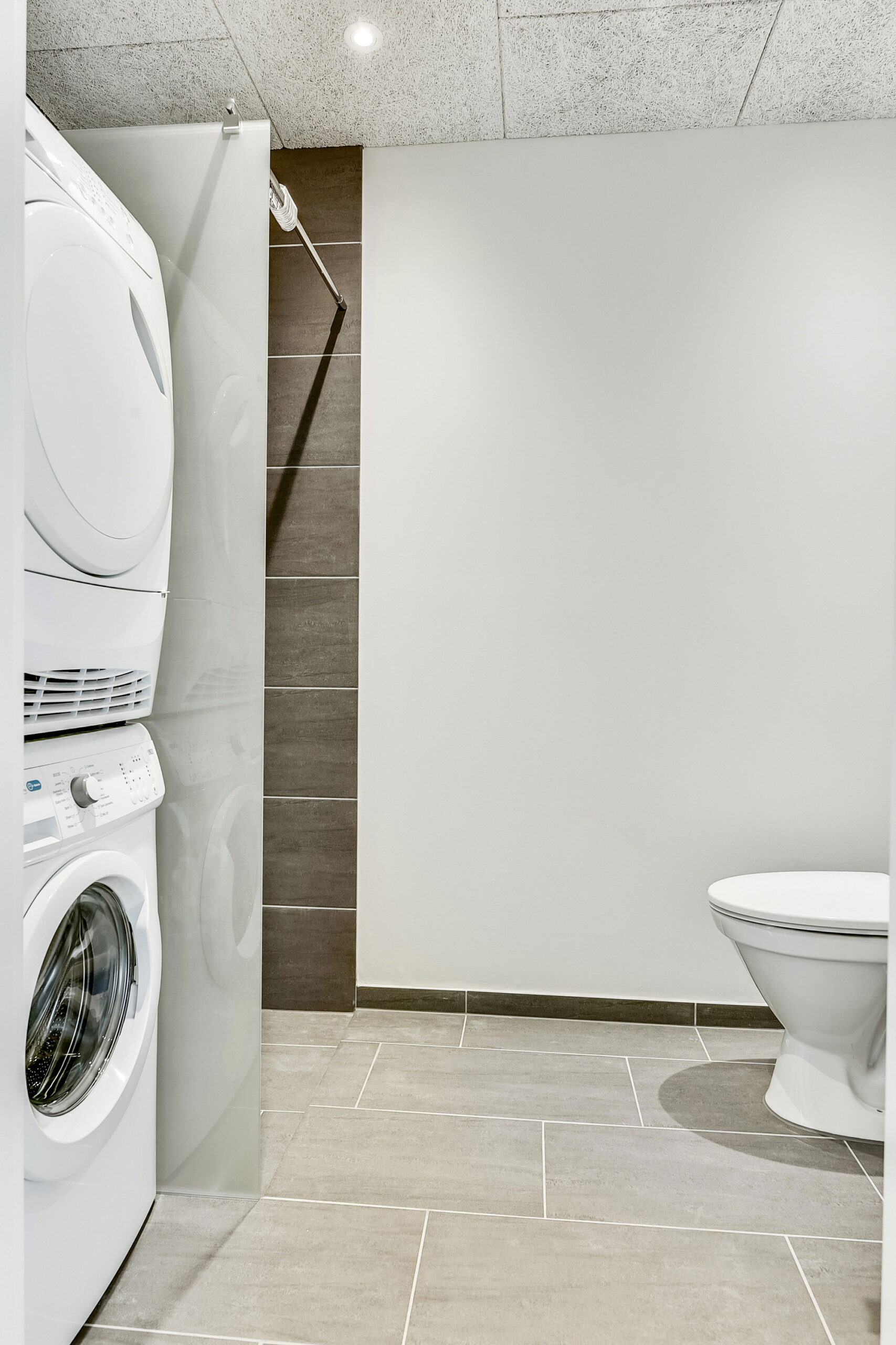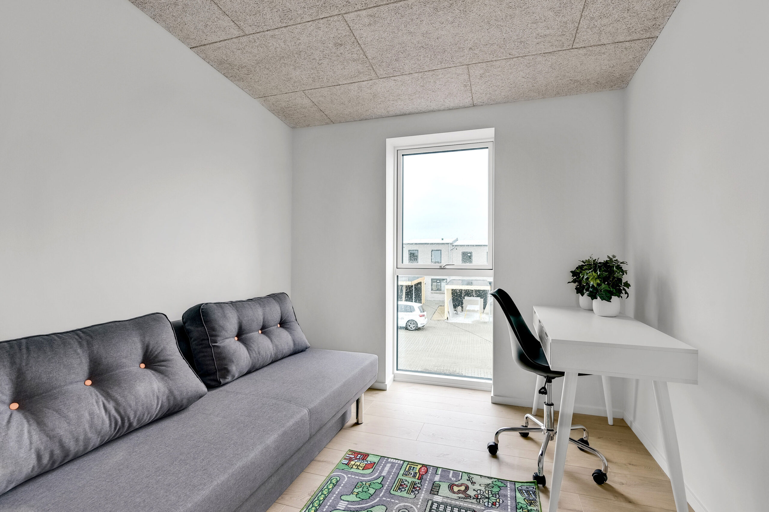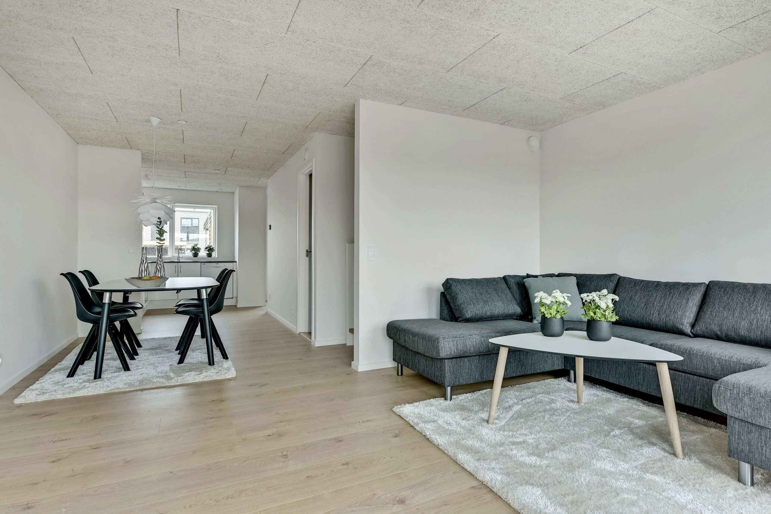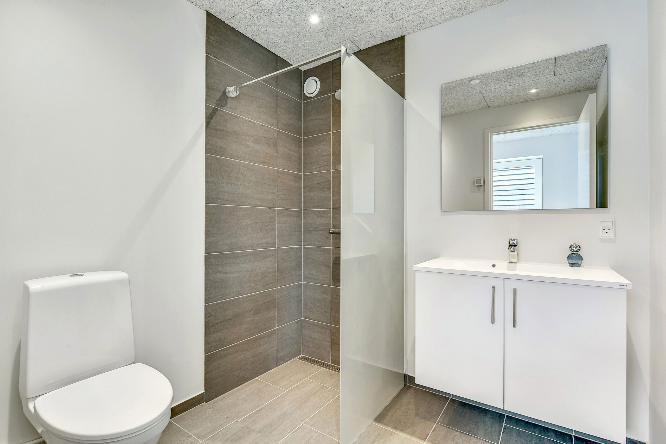 Boligen er i to plan med værelser og ekstra badeværelse på 1. sal. Vaskemaskine og tørretumbler er installeret i badeværelset på 1. sal. Boligerne er lyst og tidløst indrettet med hvide vægge og lyse Troldtekt-lignende lofter. På badeværelserne og i bryggerset er der grålige klinker på gulvet. I de øvrige rum er der lyse laminatgulve med egetræslook. Der er faste hvide Svane-elementer i køkken, bad, bryggers og på værelserne, så boligen er lige til at flytte ind i. Gulvvarme i hele stueetagen sørger for stabil og behagelig varme. På 1. salens værelser giver radiatorer mulighed for en hurtig regulering af varmen.