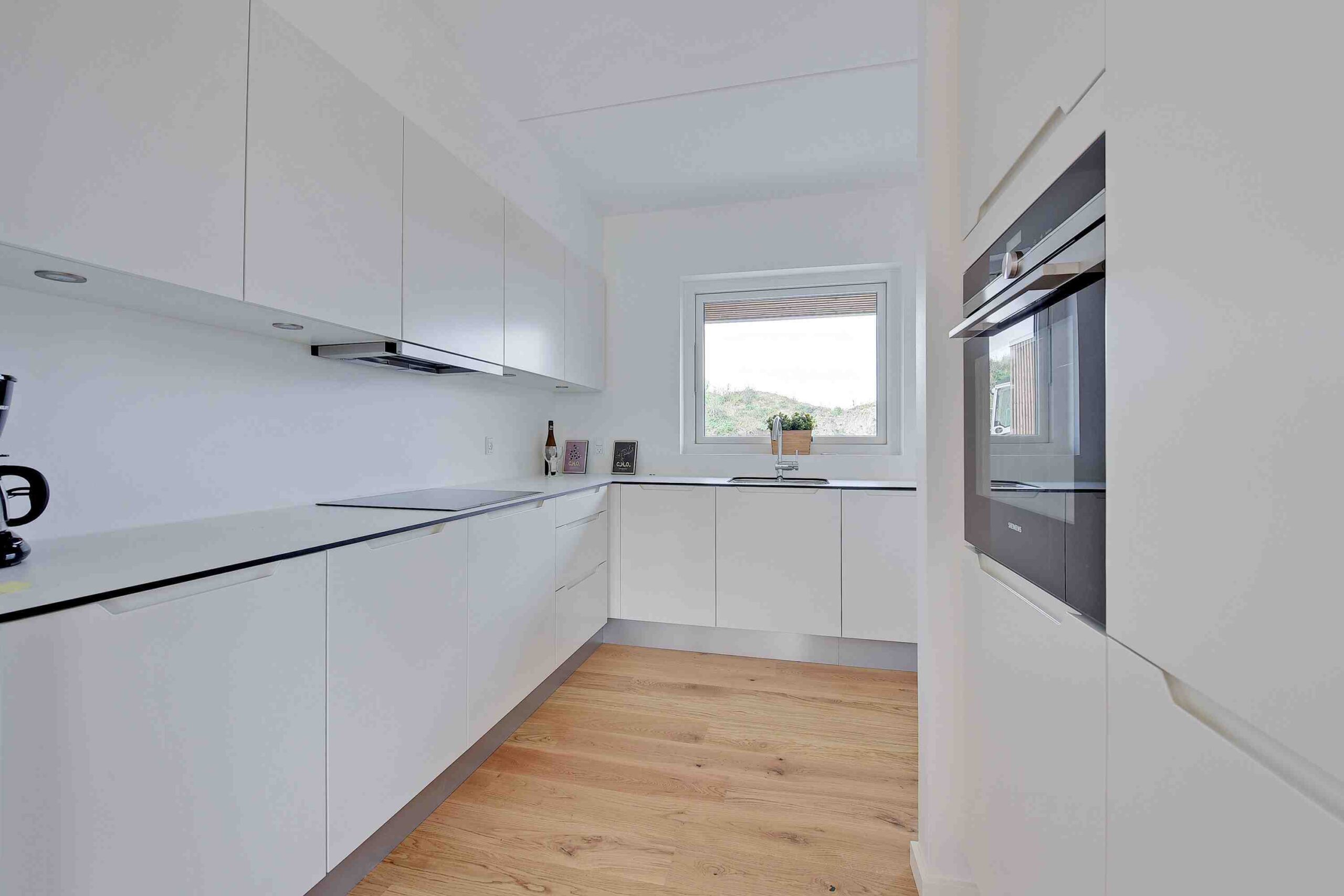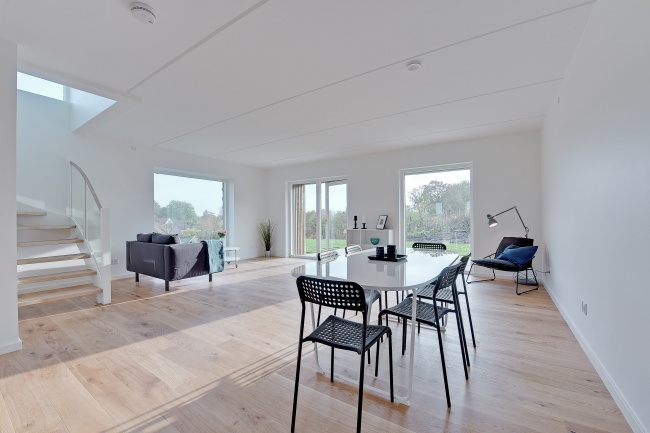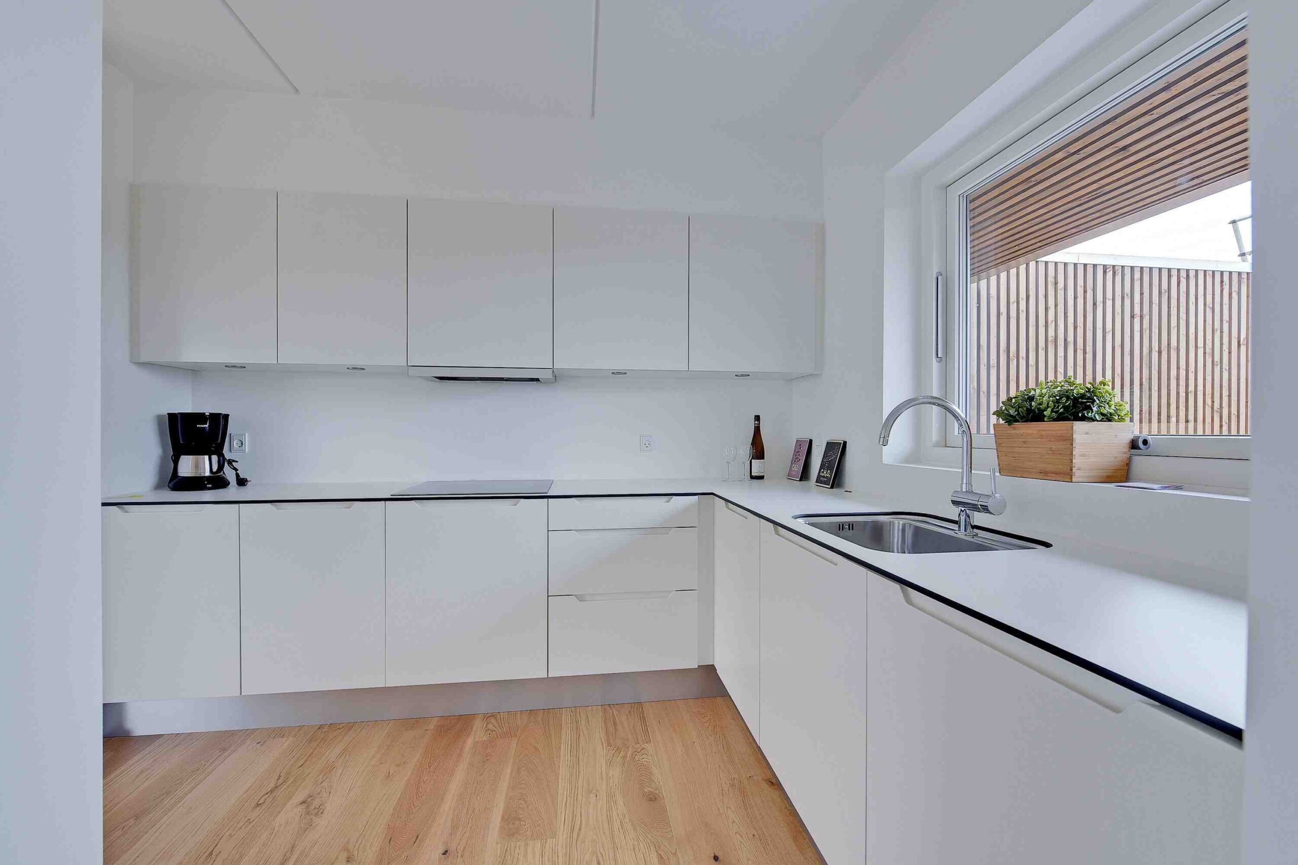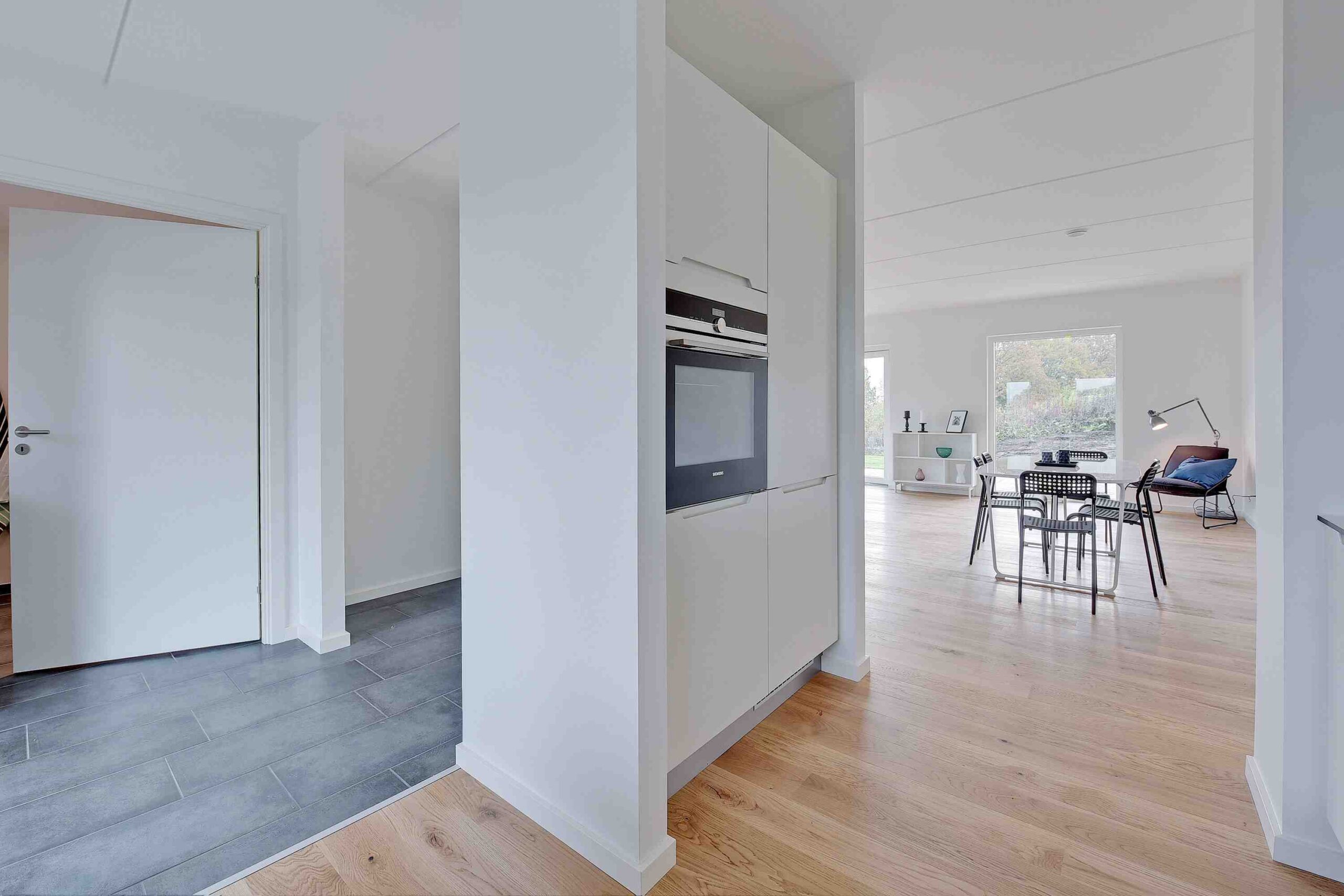 Materialevalget er generelt lyst og moderne med gulve i eg samt hvide vægge og lofter. Køkkenet er i grebsfrit hvidt design fra Invita med en sokkel i alulook, som giver køkkenet et svævende udtryk. Badeværelserne er beklædt med klinker på gulvene, som går igen i brusenicherne. Underskabene i badeværelserne er i samme design som i køkkenet. Der er vaskemaskine og tørretumbler i badeværelset i stueetagen.
