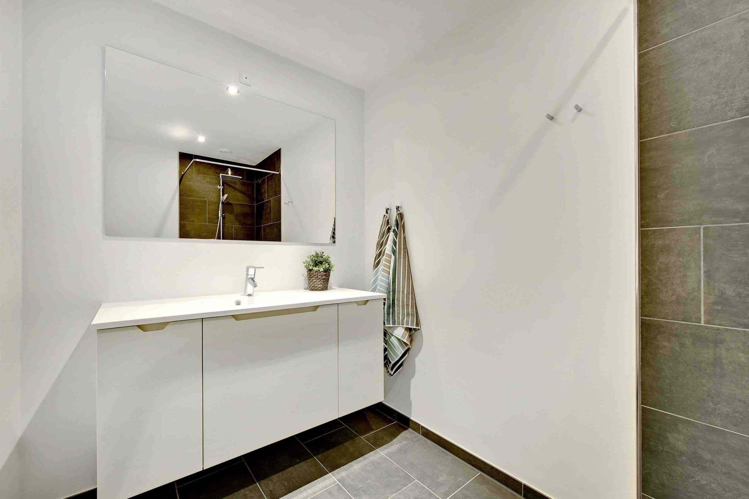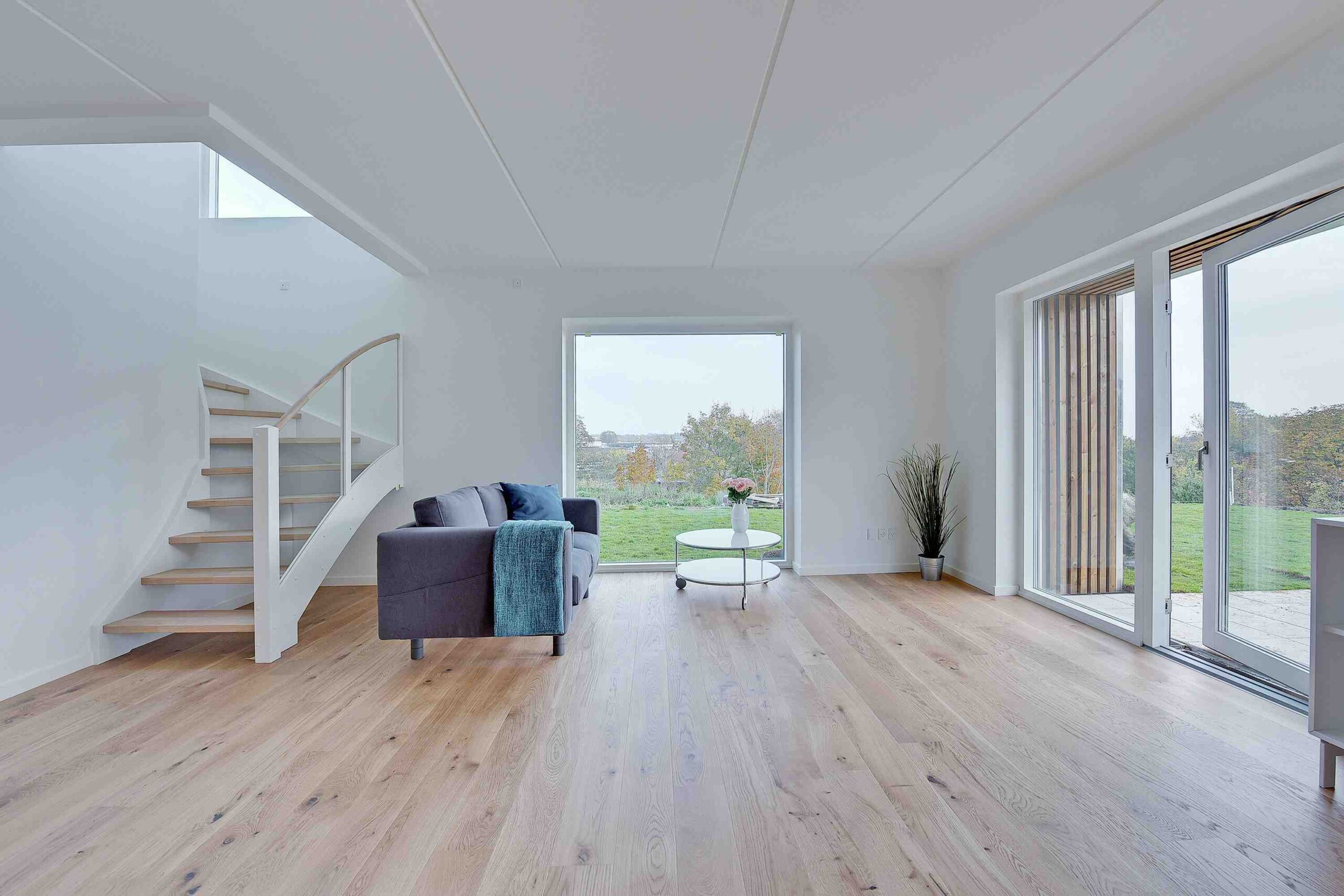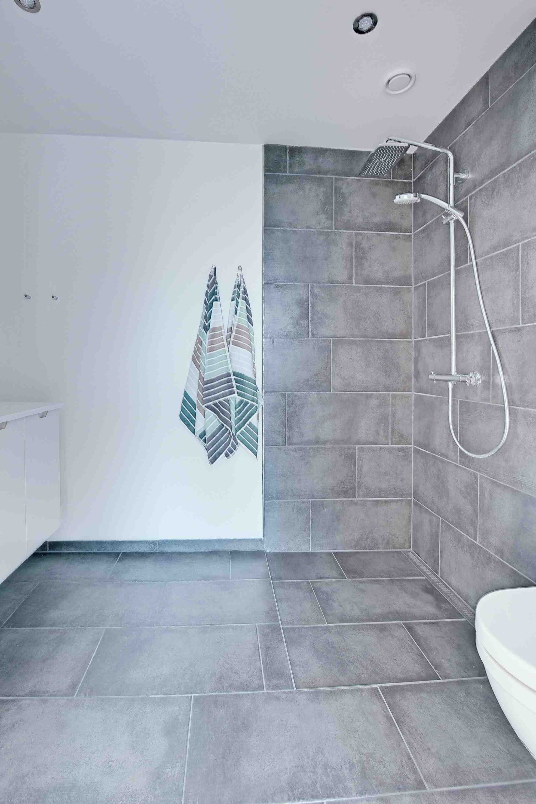 Materialevalget er generelt lyst og moderne med gulve i eg samt hvide vægge og lofter. Køkkenet er i grebsfrit hvidt design fra Invita med en sokkel i alulook, som giver køkkenet et svævende udtryk. Badeværelserne er beklædt med klinker på gulvene, som går igen i brusenicherne. Underskabene i badeværelserne er i samme design som i køkkenet. Der er vaskemaskine og tørretumbler i badeværelset i stueetagen.