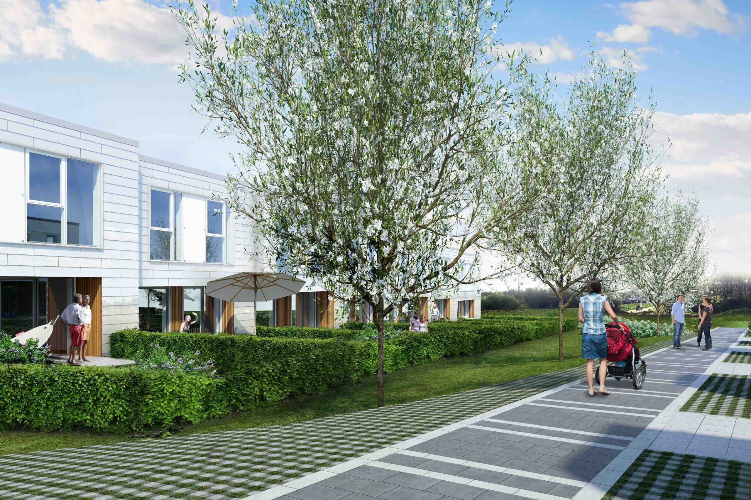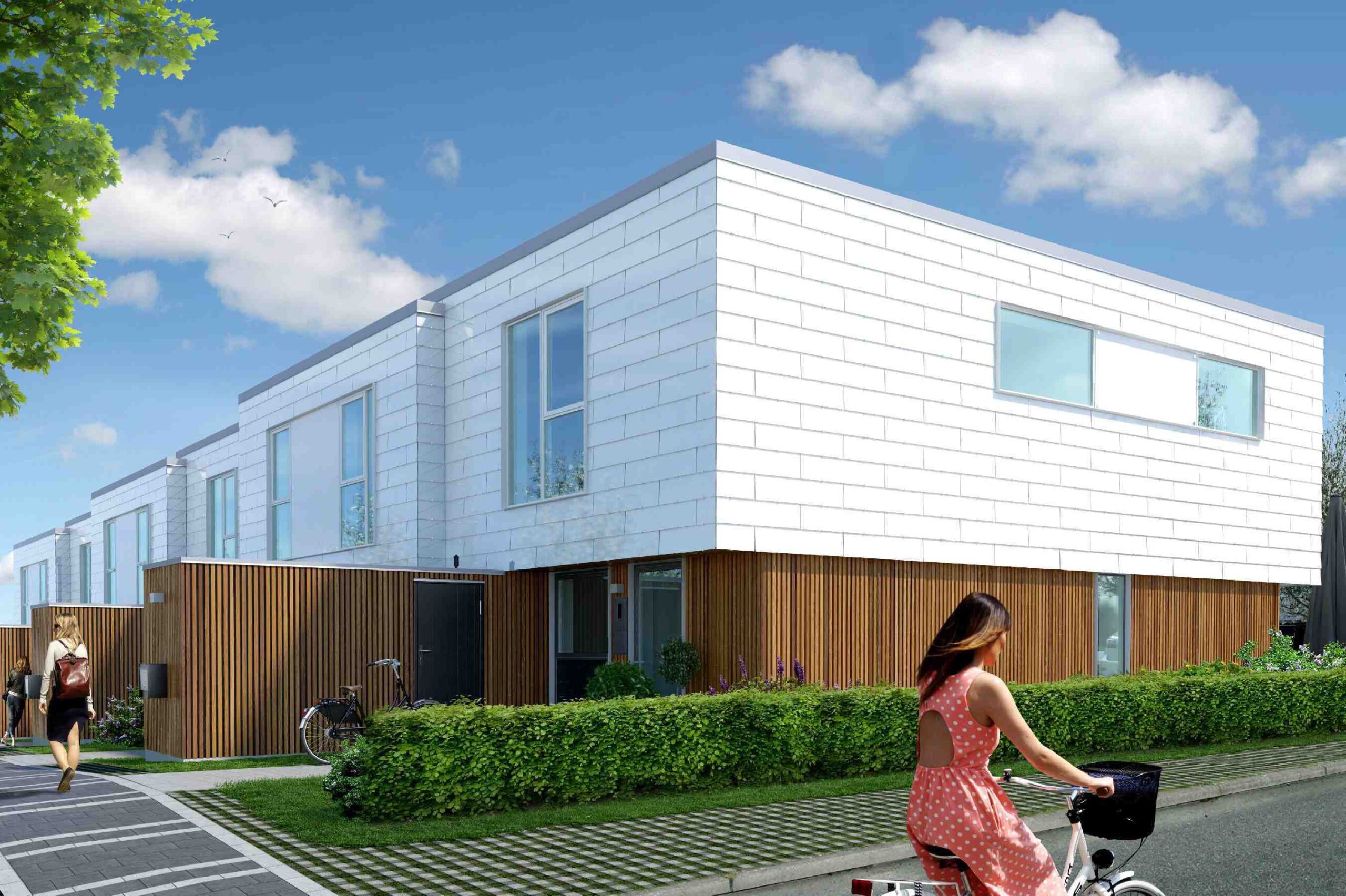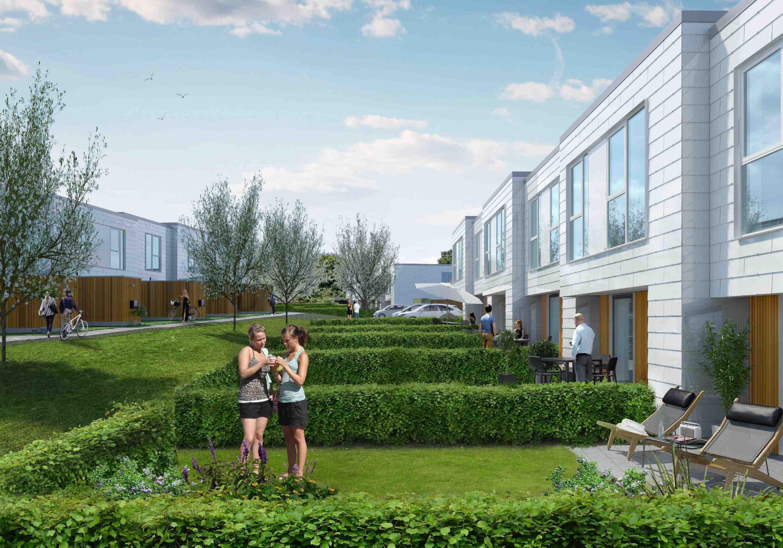 Området består i sin endelige form af en stribe rækkehuse, der alle er i to etager. Husene står lyse og lette med en næsten svævende overetage i det satinerede glas oven på en mørk trælistebeklædning, der udgør stueetagens facader. Det varme træ sidder, hvor man færdes, og hvor man er tæt på. Den faste træbeklædning står i fin kontrast til glasbeklædningens glatte og præcise overflader. De to forskelligartede materialer kontrasterer hinanden godt og fremhæver forskellene imellem dem – symboliseret i naturen og kulturen.